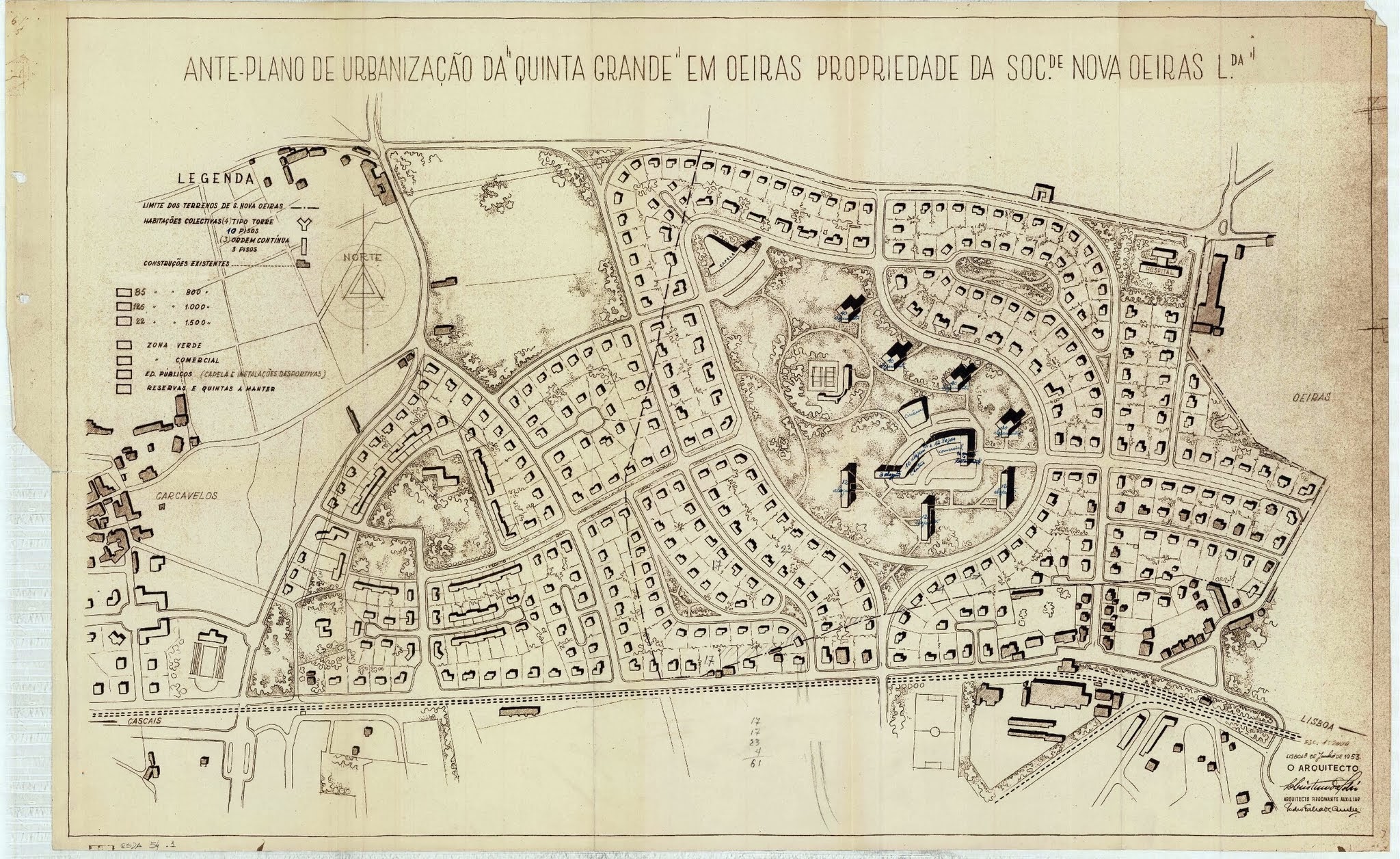 O estudo urbanístico teve em conta o plano já existente da Quinta dos Lombos, em Carcavelos, o acesso pela marginal e o traçado dos arruamentos junto à estação ferroviária de Oeiras. O plano geral foi aprovado pelo Ministro das Obras Públicas, por despacho de 1 de abril de 1954, e o licenciamento da urbanização ficou registado na escritura pública de 21 de junho de 1956. A urbanização abrangia uma área de 420 mil metros quadrados, com a construção do núcleo-base — centro comercial, blocos e torres — concluída em 1961.