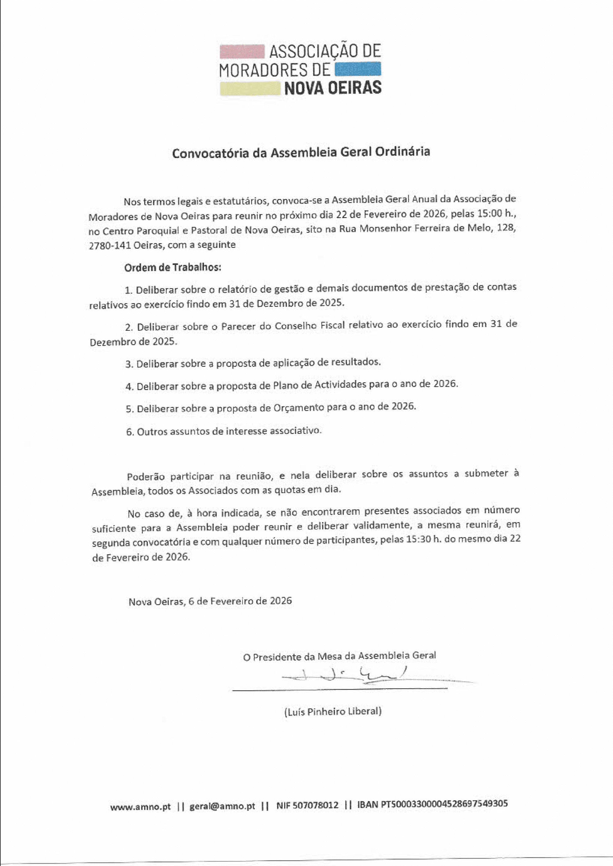 A Associação de Moradores de Nova Oeiras (AMNO) informa que a sua Assembleia Geral Anual terá lugar no próximo dia 22 de Fevereiro de 2026, pelas 15:00, no Centro Social Paroquial de Nova Oeiras, localizado na Rua Monsenhor Ferreira de Melo, 128, 2780-141 Oeiras.