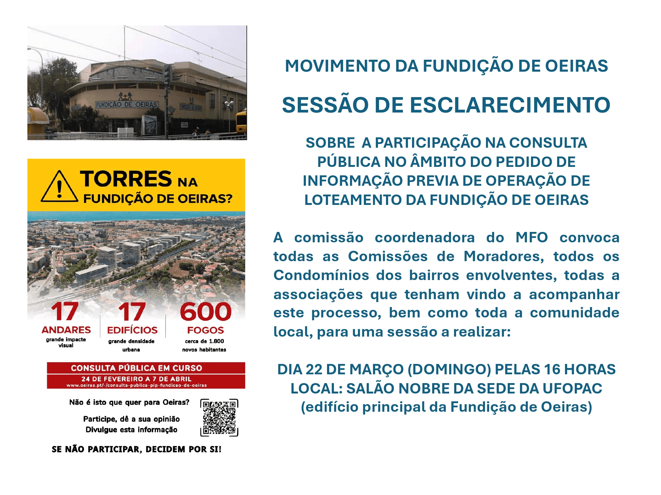 A comissão coordenadora do Movimento Fundição de Oeiras (MFO), do qual a Associação de Moradores de Nova Oeiras (AMNO) faz parte juntamente com outras associações locais, convoca todos os moradores, condomínios e associações do concelho que têm vindo a acompanhar este processo, bem como toda a comunidade local para uma sessão de esclarecimento no próximo domingo, dia 22 de Março, pelas 16 horas.